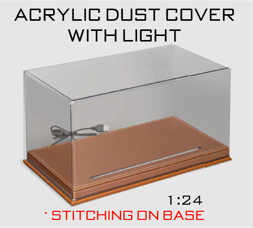 Protect and display your prized diecast models with our Illuminated Acrylic Dust Cover. This elegant case features a sleek brown base adorned with striking white stitching, adding a touch of sophistication to your collection. Equipped with a soft, energy-efficient 5V LED light, the cover highlights your models while keeping them safe from dust and scratches. The durable 3mm clear acrylic top provides a perfect view of your display, ensuring your models shine both day and night.