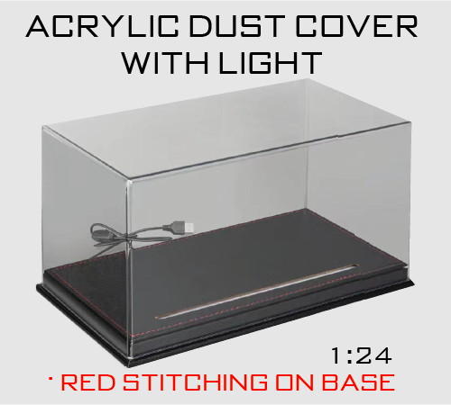 Protect and display your prized diecast models with our Illuminated Acrylic Dust Cover. This elegant case features a sleek black base adorned with striking red stitching, adding a touch of sophistication to your collection. Equipped with a soft, energy-efficient 5V LED light, the cover highlights your models while keeping them safe from dust and scratches. The durable 3mm clear acrylic top provides a perfect view of your display, ensuring your models shine both day and night.